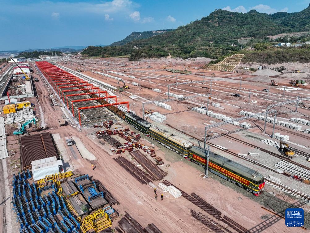 9月5日,运载500米长钢轨的列车抵达中铁十一局渝厦高铁重庆东站动车所铺轨基地(无人机照片)。
