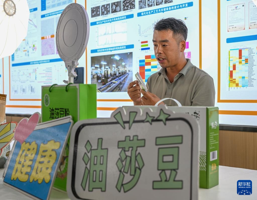 9月6日,工作人员在兴安镇一家油莎豆加工企业通过直播销售油莎豆产品。