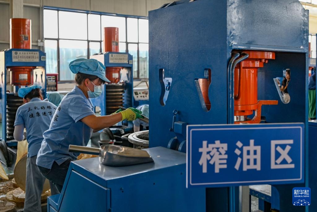 9月6日,工人在兴安镇一家油莎豆加工企业操作榨油机。