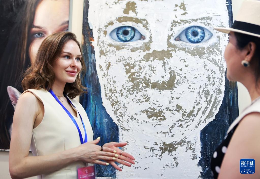 9月6日,一名来自俄罗斯的画家(左)向参观者介绍自己的画作。
