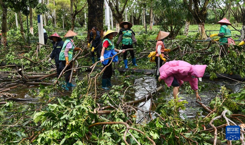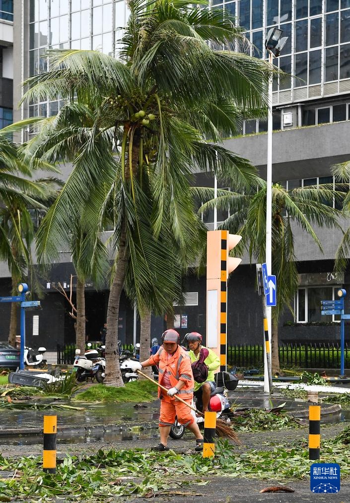 9月7日,工作人员在海口市滨海大道上清理道路。