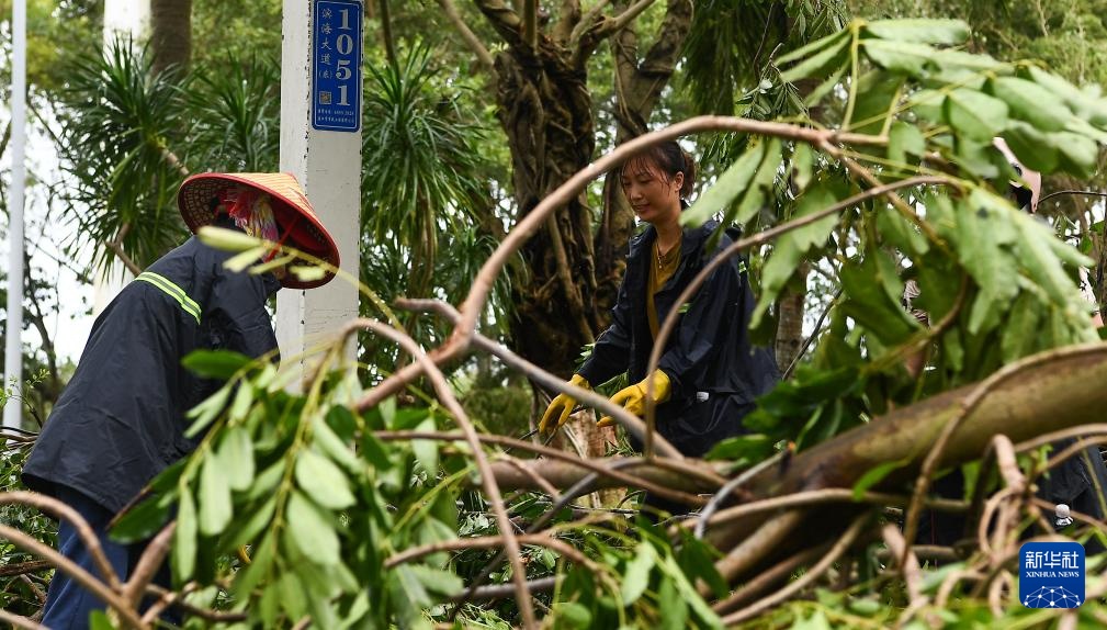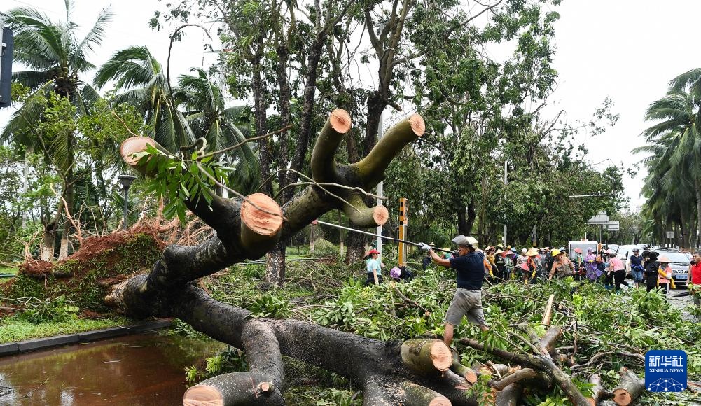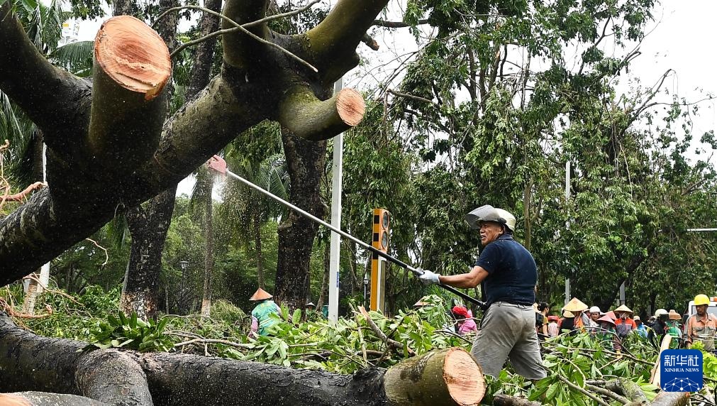 9月7日,工作人员在海口市滨海大道上清理被风吹倒的树木。