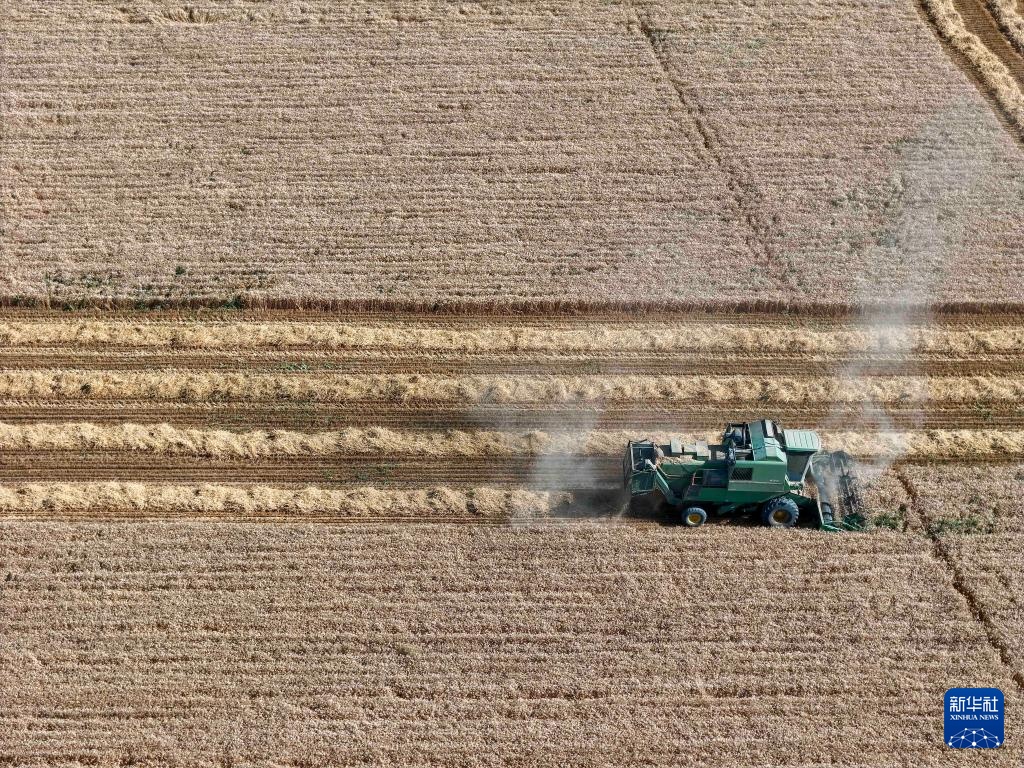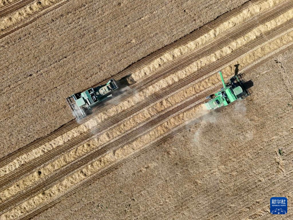 9月7日,收割机在新疆生产建设兵团第十三师新星市红山农场收割小麦(无人机照片)。