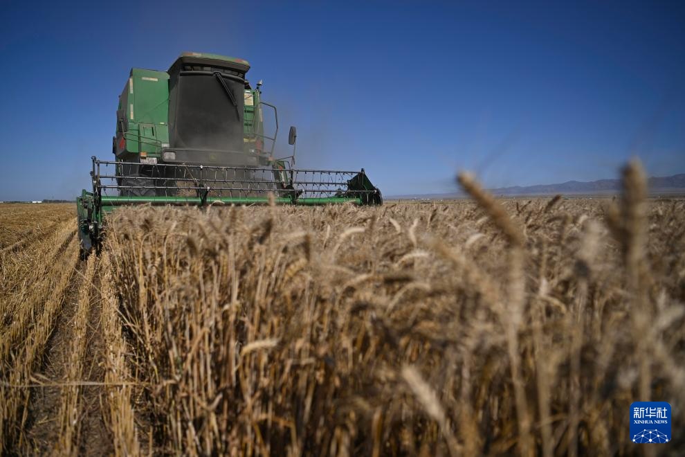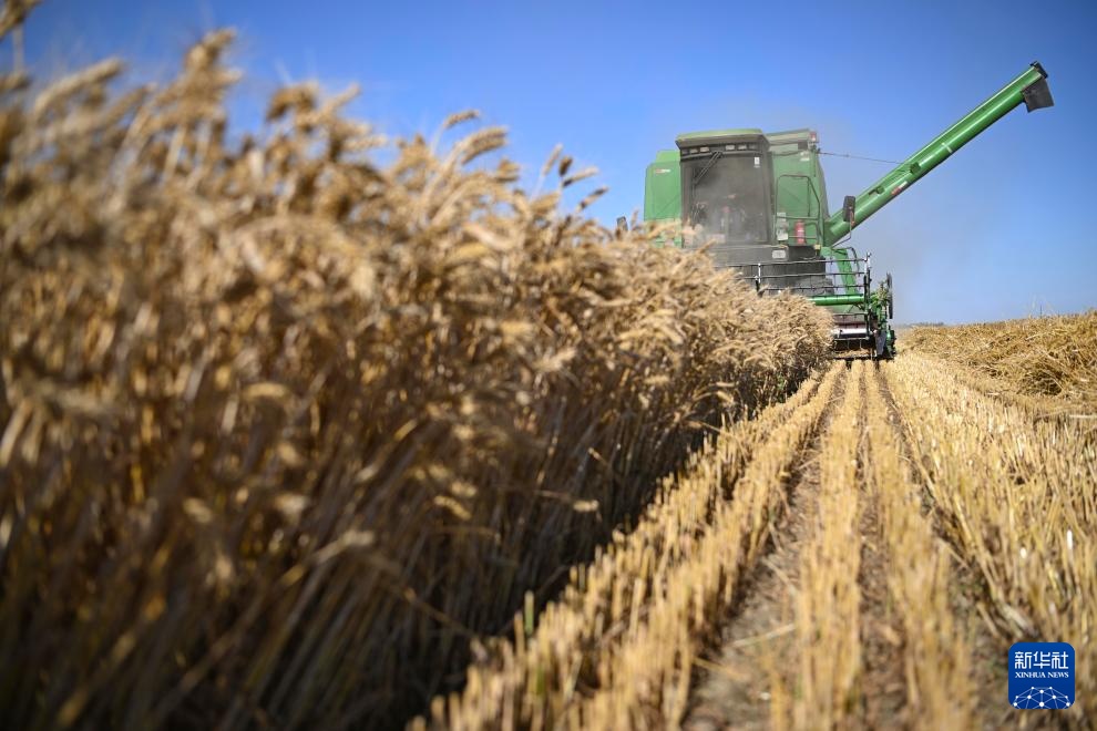 9月7日,农户驾驶收割机在新疆生产建设兵团第十三师新星市红山农场收割小麦。