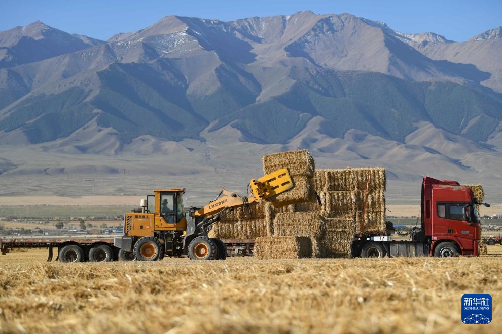 9月7日,农户在新疆生产建设兵团第十三师新星市红山农场转运小麦秸秆。这些秸秆将用作造纸原料、牲畜饲草料等。