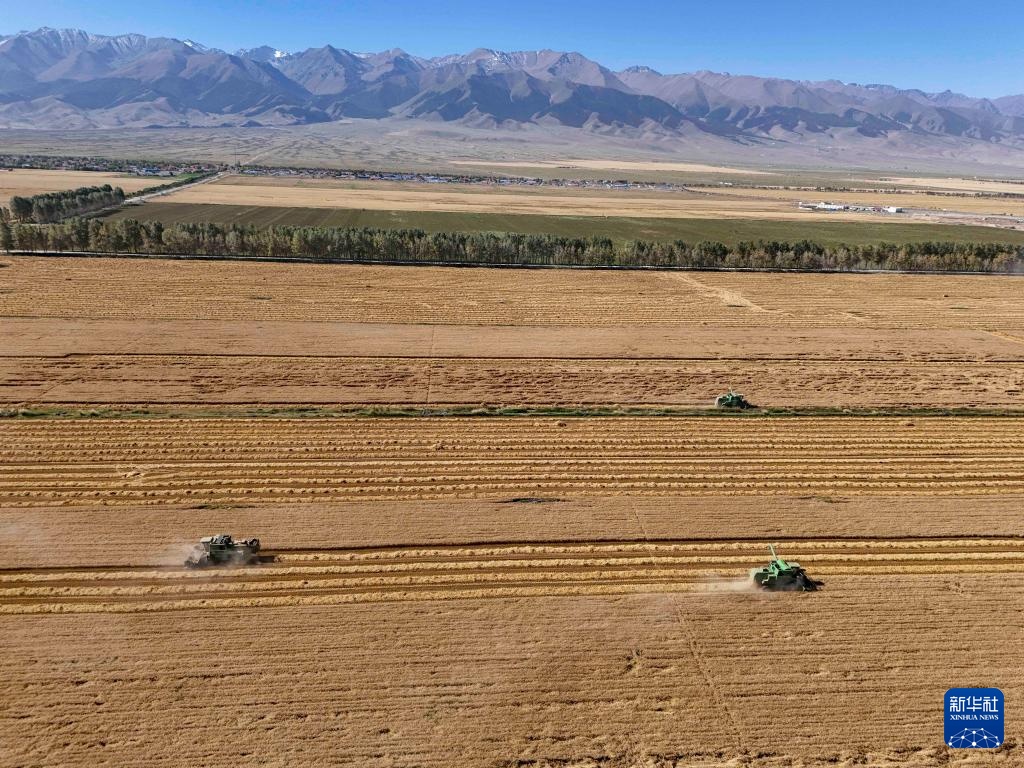 新疆生产建设兵团第十三师新星市红山农场地处天山北麓,是重要粮食产区。近日,红山农场的春小麦迎来收获季。田间麦浪滚滚,机声隆隆,农场职工群众忙着抢收小麦。