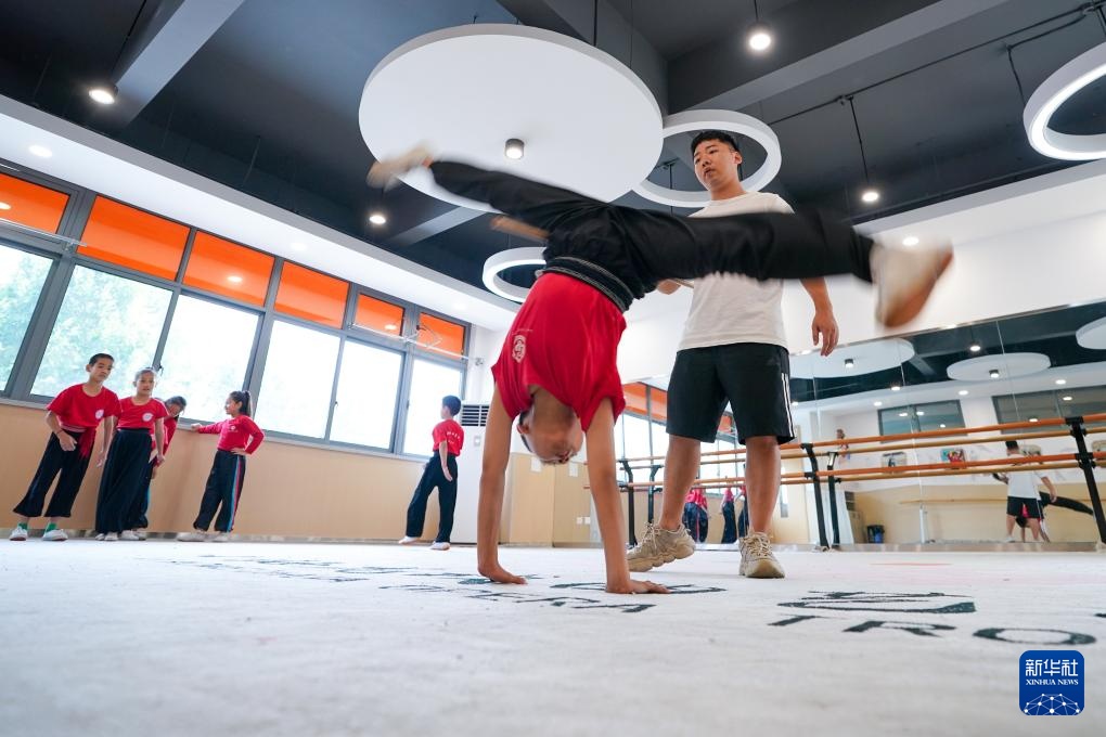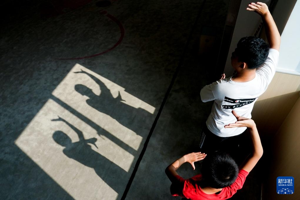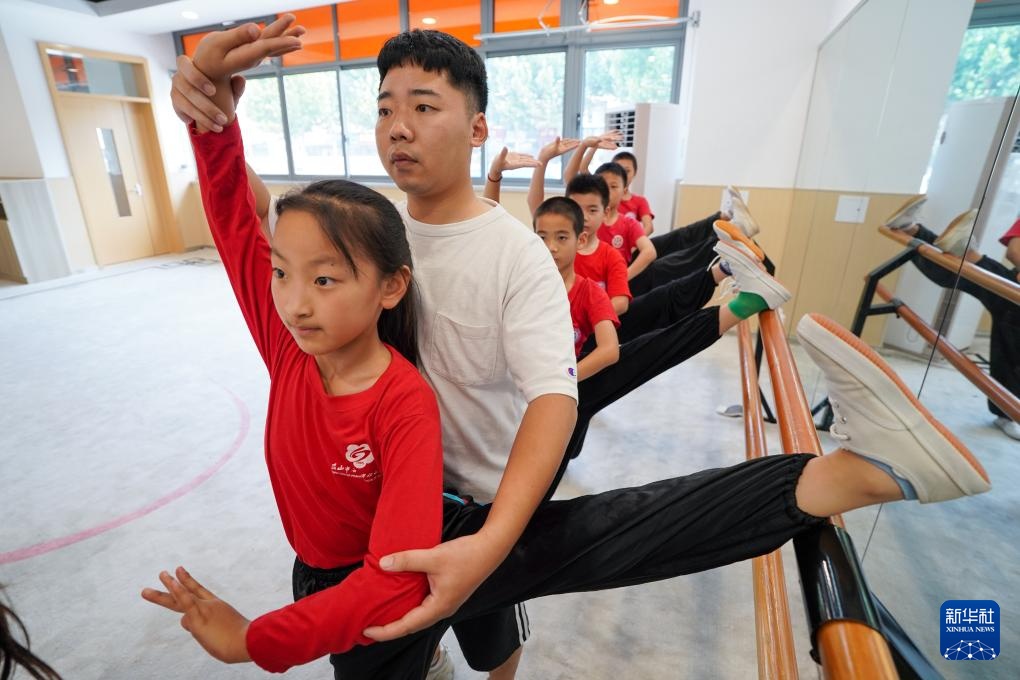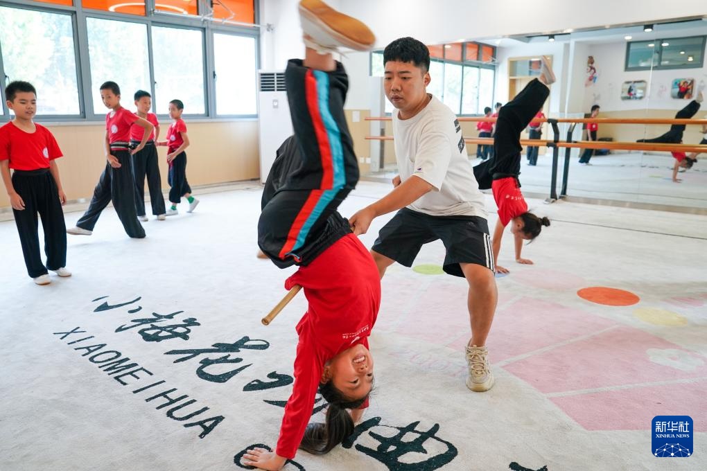 小昆班专职老师周杰在石牌中心小学校训练房内指导学员训练(9月6日摄)。