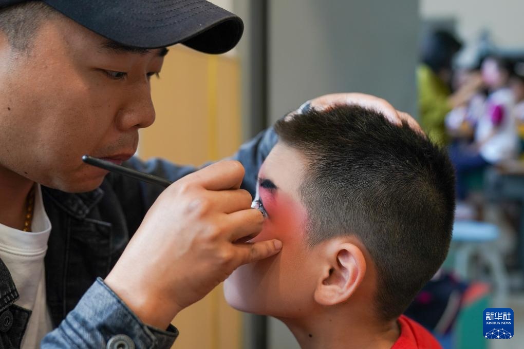 在石牌中心小学校训练房内,小昆班专职老师周杰(左)在为一位小学员化妆,准备进行“六一”儿童节表演(5月31日摄)。