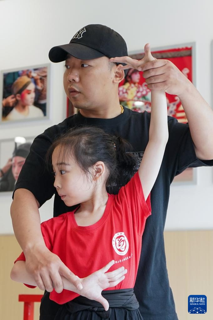 小昆班专职老师周杰(右一)带着学员们准备进行昆曲剧目专项表演训练(5月30日摄)。