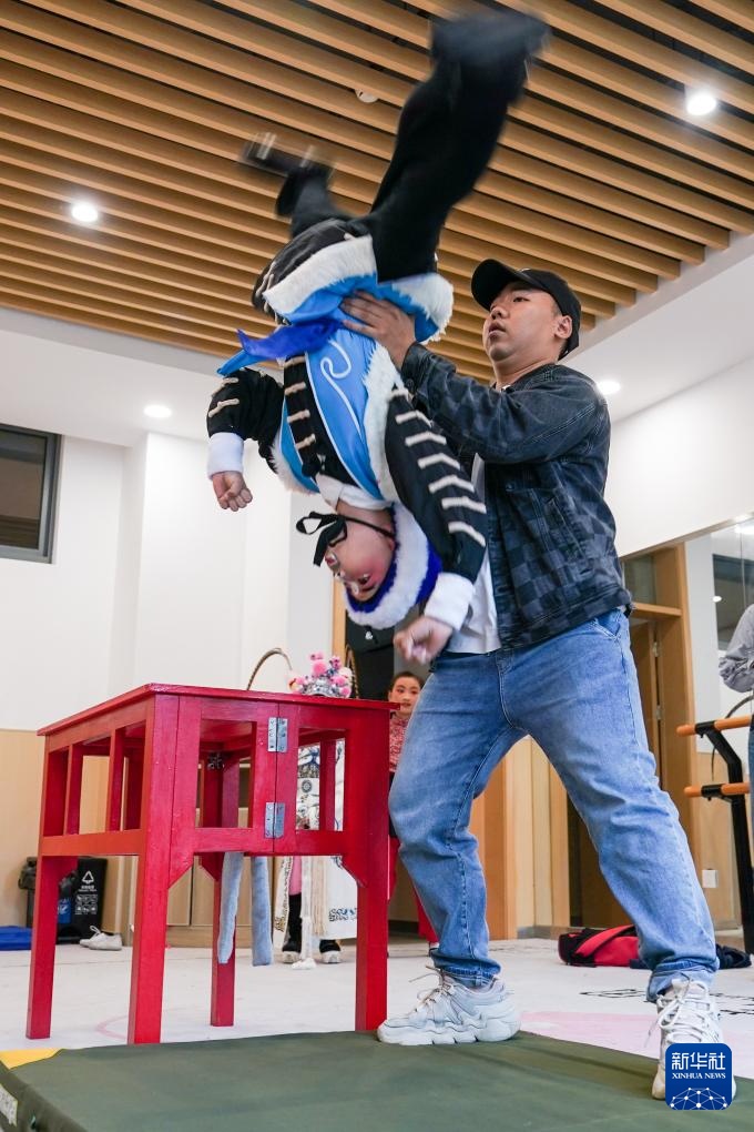 在石牌中心小学校训练房内,小昆班专职老师周杰(右)带着小学员热身,准备进行“六一”儿童节表演(5月31日摄)。