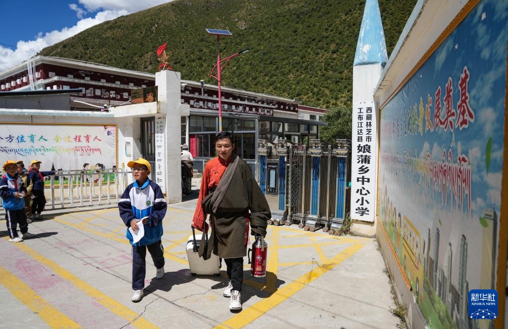 娘蒲乡中心小学门口,王登领着儿子贡乔热旦(左)准备回家(9月4日摄)。