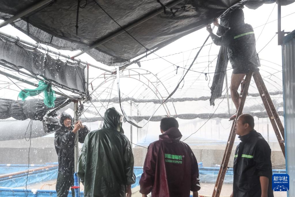 9月7日,在海南省文昌市翁田镇,一家养殖场的工人在加固厂房。
