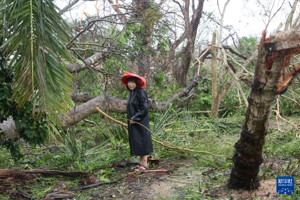 9月7日,在海南省文昌市翁田镇大福村,村民在清理被风吹倒的树木。