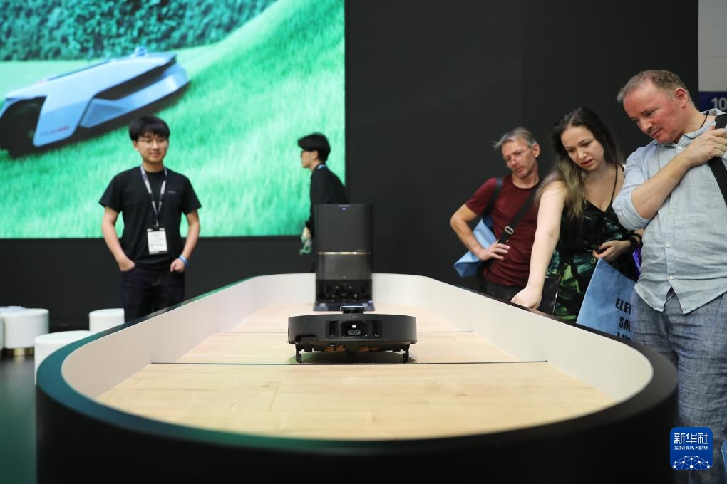 9月7日,在德国柏林国际消费电子展追觅科技展区,参观者观看一台扫地机器人跨越台阶。