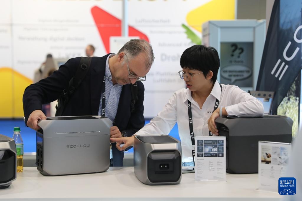 9月7日,在德国柏林国际消费电子展正浩创新展区,工作人员为参观者介绍一款储能产品。