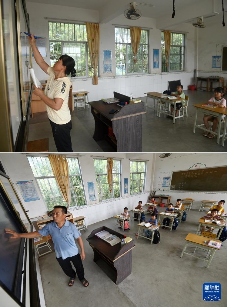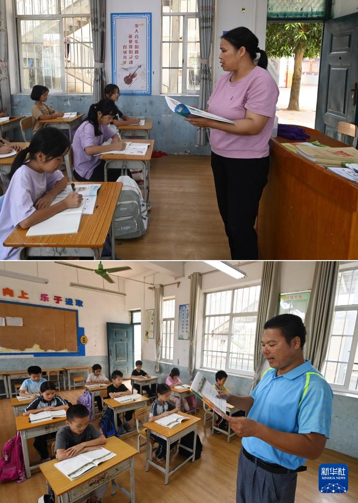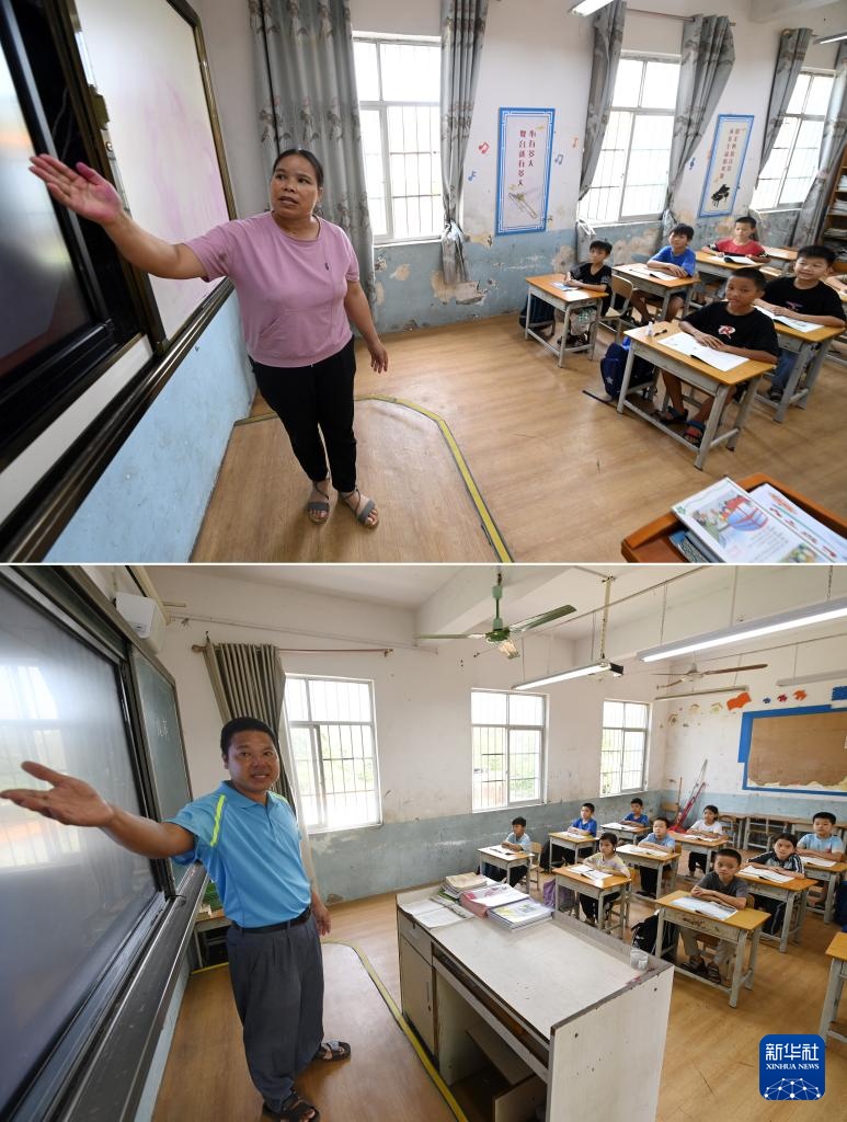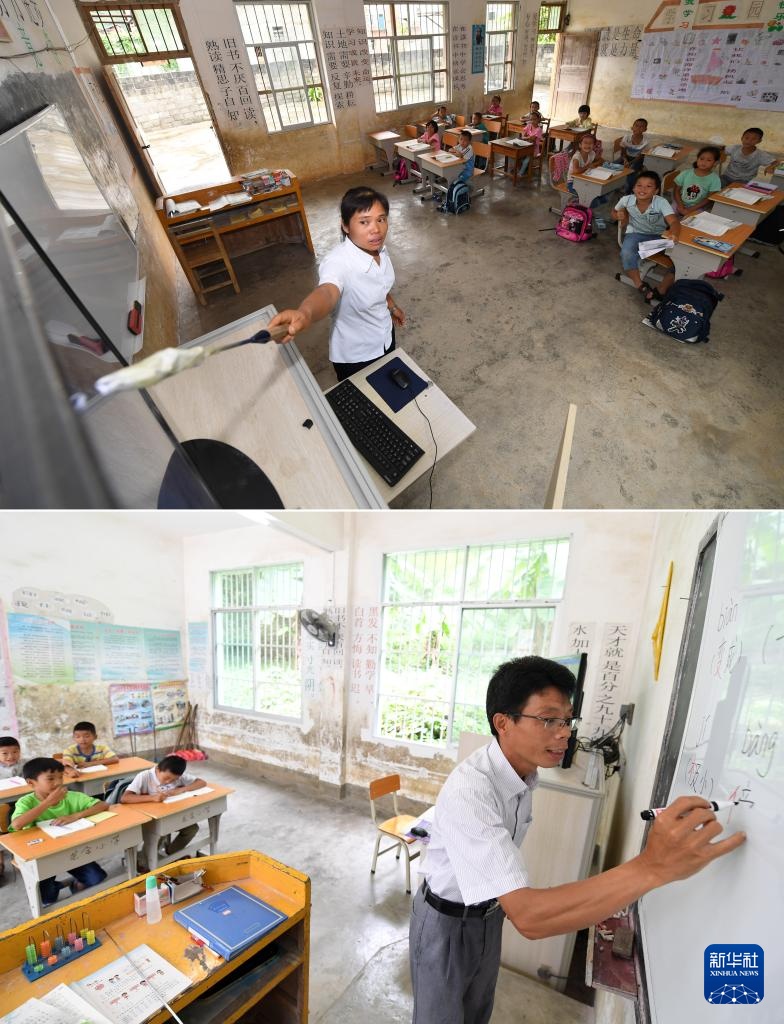 拼版照片:在广西南宁市邕宁区中和镇平天小学,孙庆莲老师(上图)、张宝新老师(下图)在给学生上课(9月5日摄)。孙庆莲和张宝新是这所学校的一对夫妻教师。