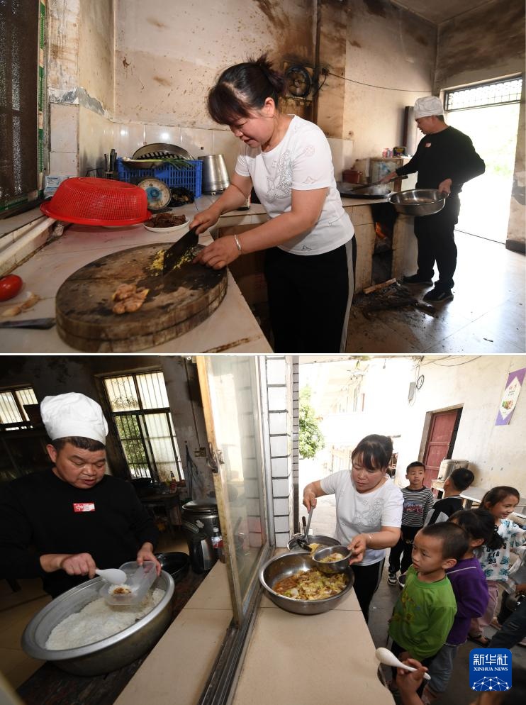 新拼版照片:在广西德保县东凌镇那王小学,黄秀碧老师(左)和黄永勇老师在给学生做午饭(上图);黄秀碧老师(右)和黄永勇老师在给学生分午饭(下图)(2023年3月22日摄)。那王小学只有黄秀碧和黄永勇这两名夫妻教师,他们分别在这里工作了31年和20年。他们每天除了给学生上课,为学生做午饭,晚上还要照顾住校生。