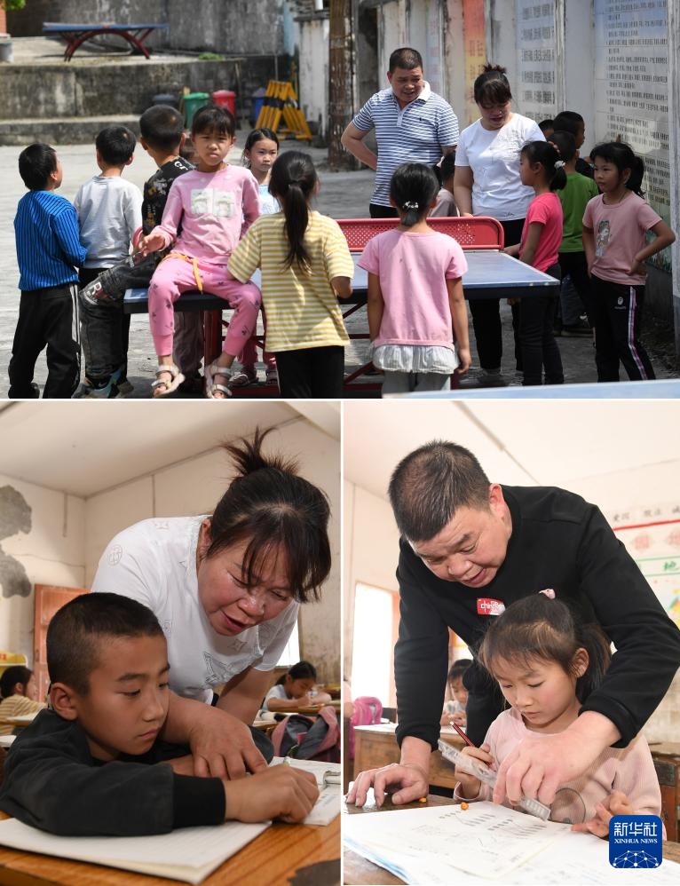 拼版照片:在广西南宁市邕宁区中和镇中心学校周禄教学点,黄宏芳老师课间和学生交流(上图);玉济侯老师在辅导学生功课(下图)(9月4日摄)。黄宏芳和玉济侯是这所教学点的一对夫妻教师,他们分别于2003年9月和2001年3月到这里工作。