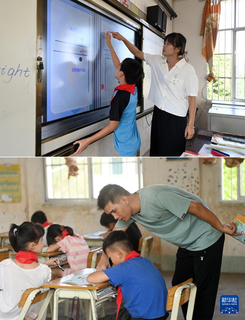拼版照片:在广西南宁市邕宁区中和镇中心学校那才教学点,孙少华老师在给学生上课(上图);施秉效老师在辅导学生功课(下图)(9月5日摄)。孙少华和施秉效是这所教学点的一对夫妻教师,他们分别于2008年和2007年到这里工作,这所教学点目前只有3名老师。