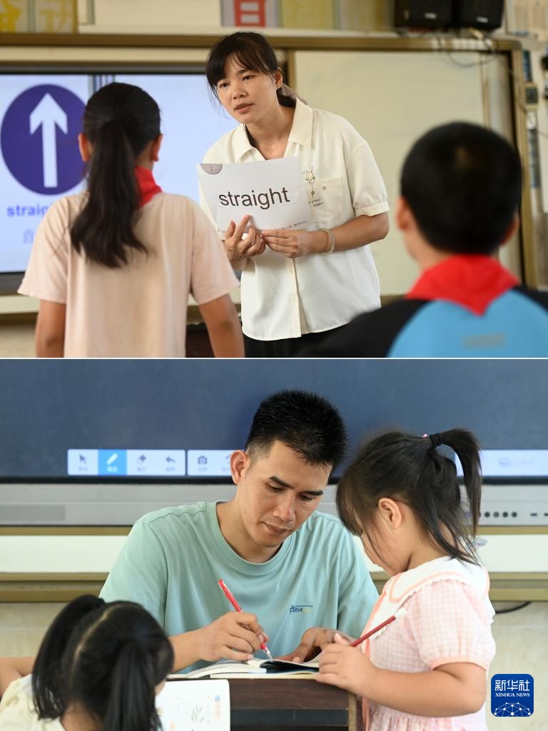 拼版照片:在广西南宁市邕宁区中和镇坛西小学,方雪芝老师(上图)、杨铎老师(下图)在辅导学生功课(9月5日摄)。方雪芝和杨铎是这所学校的一对夫妻教师。