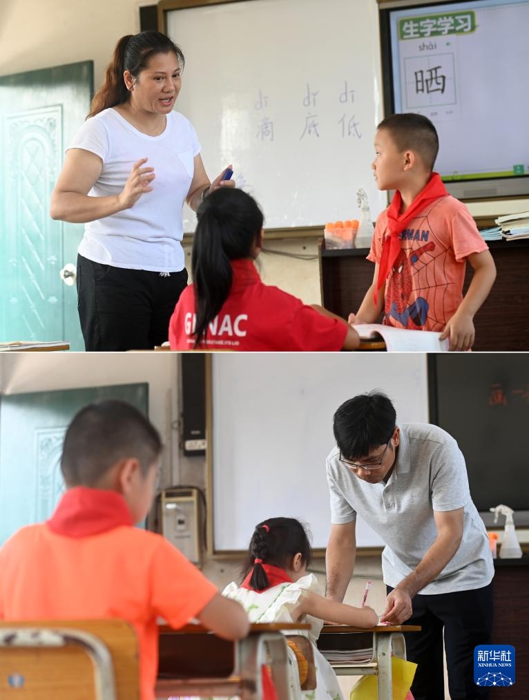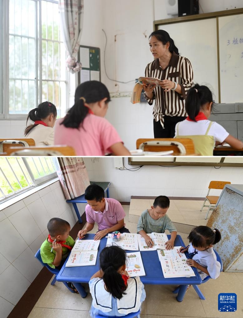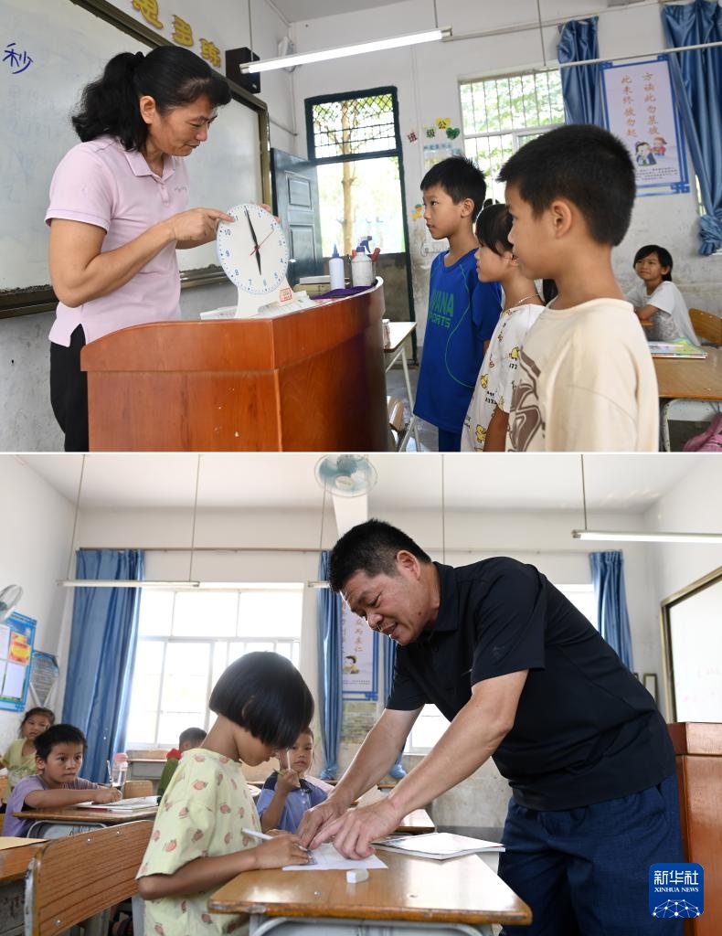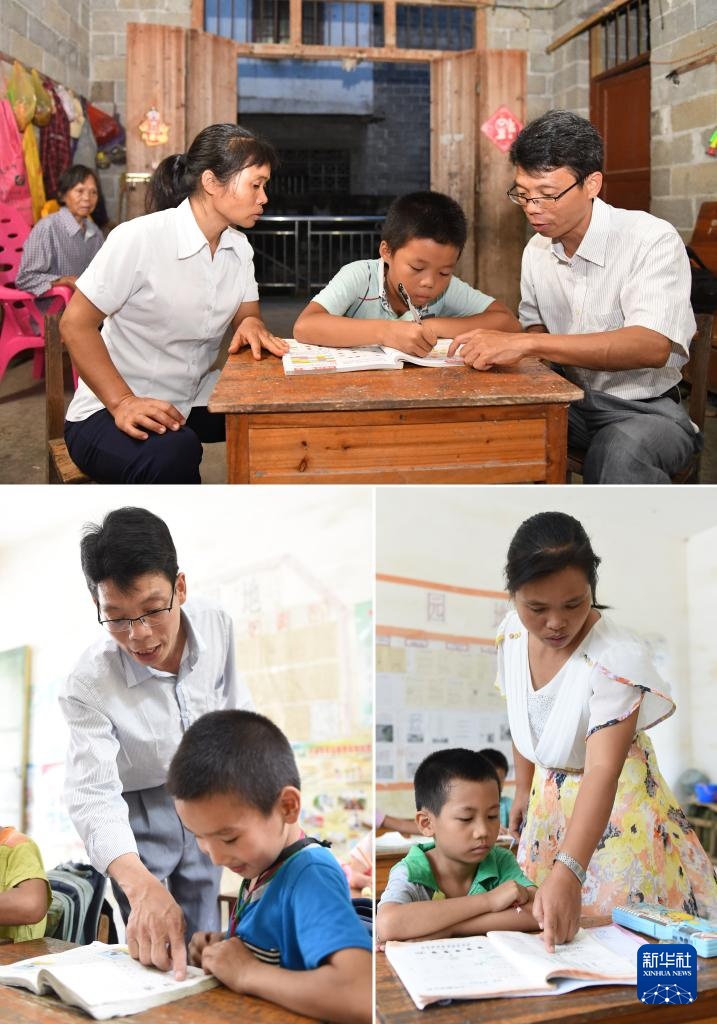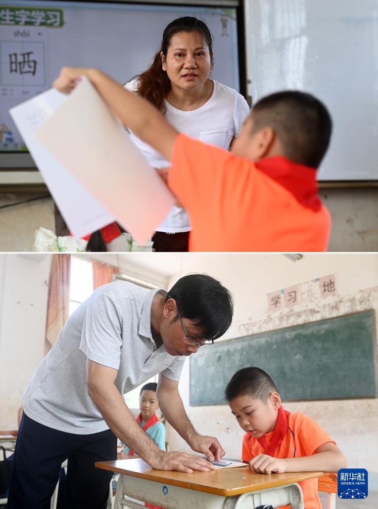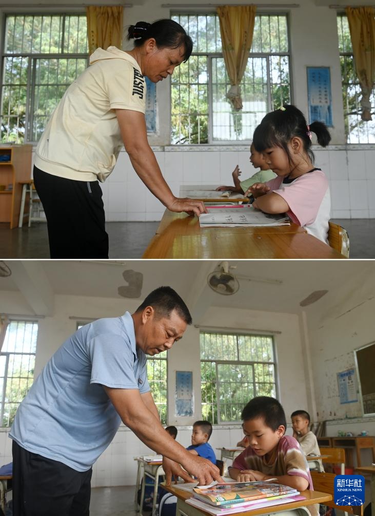 拼版照片:广西南宁市邕宁区中和镇中心学校施灵教学点,孙春英老师(上图)、何国文老师(下图)在辅导学生功课(9月5日摄)。何国文和孙春英是这所教学点的一对夫妻教师,这所教学点目前只有3名老师。