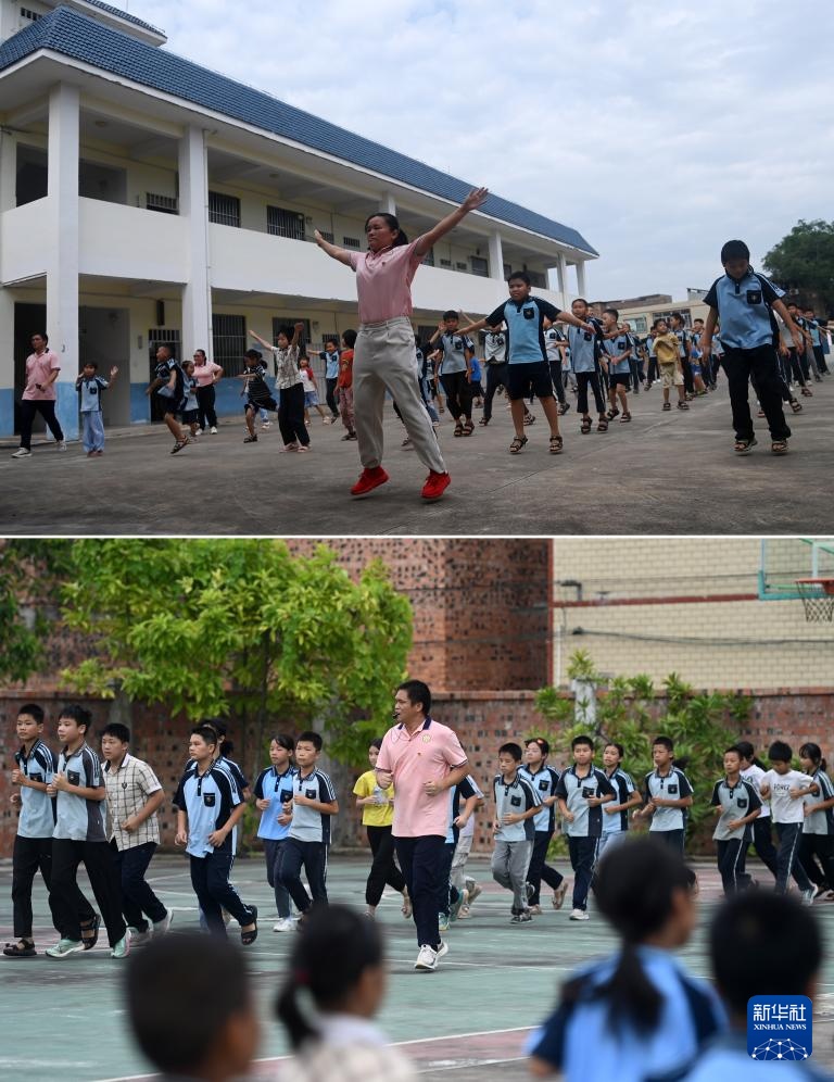 拼版照片:在广西南宁市邕宁区蒲庙镇光和小学那岳教学点,莫庆如老师带领学生做课间操(上图);梁金养老师带领学生跑步(下图)(9月6日摄)。莫庆如和梁金养是这所教学点的一对夫妻教师,他们分别在2004年和2005年到这里工作,2022年因敬业奉献一起登上“中国好人榜”。