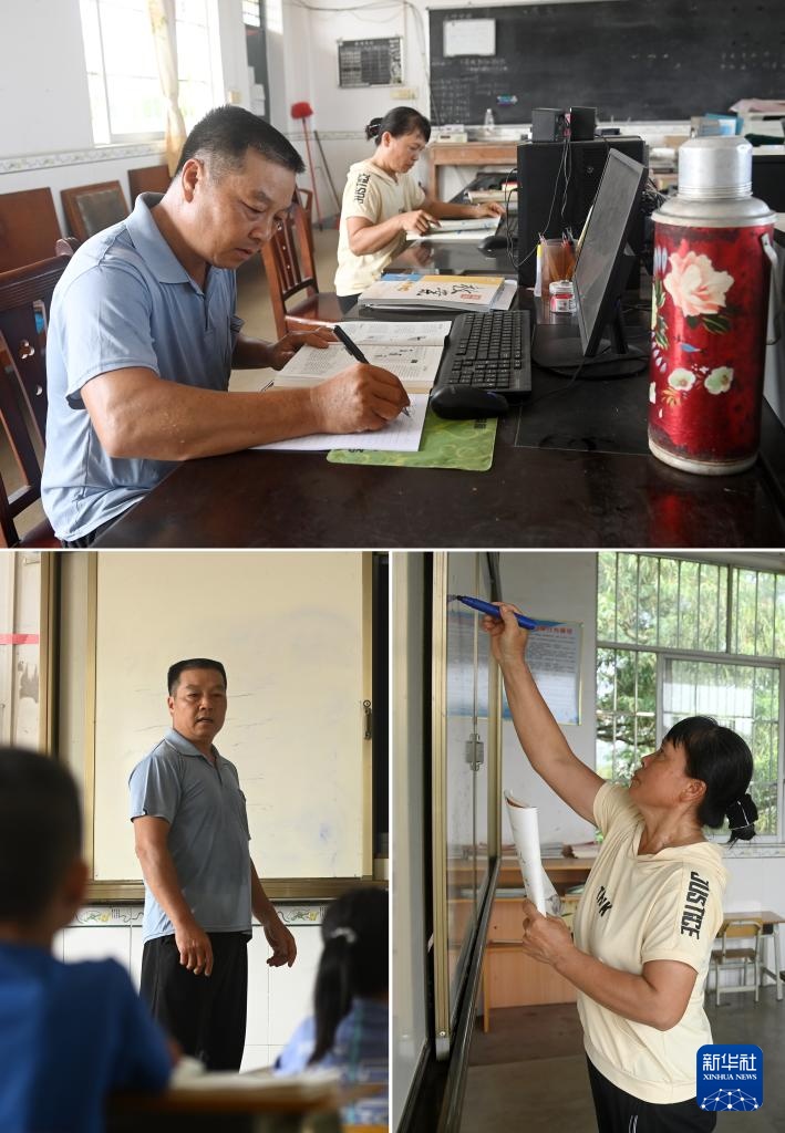 拼版照片:在广西南宁市邕宁区中和镇中心学校施灵教学点,何国文老师(左)和孙春英老师在备课(上图);何国文老师(左下图)、孙春英老师(右下图)在给学生上课(9月5日摄)。何国文和孙春英是这所教学点的一对夫妻教师,这所教学点目前只有3名老师。