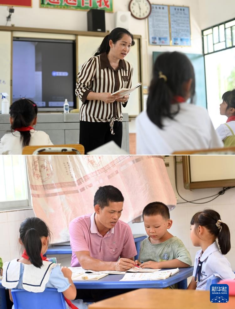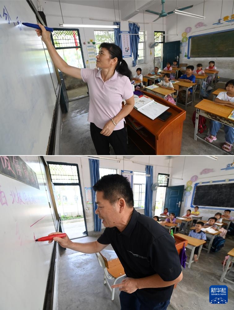 拼版照片:在广西南宁市邕宁区蒲庙镇光和小学那岳教学点,莫庆如老师(左图)、梁金养老师(右图)在给学生上课(9月6日摄)。莫庆如和梁金养是这所教学点的一对夫妻教师,他们分别在2004年和2005年到这里工作,2022年因敬业奉献一起登上“中国好人榜”。