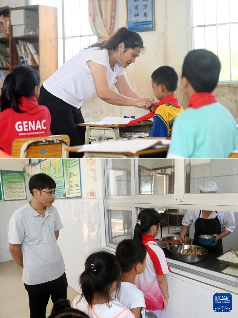 拼版照片:在广西南宁市邕宁区中和镇中心学校周禄教学点,黄宏芳老师在帮一名学生系红领巾(上图);玉济侯老师在维持学生排队打午饭秩序(下图)(9月4日摄)。黄宏芳和玉济侯是这所教学点的一对夫妻教师,他们分别于2003年9月和2001年3月到这里工作。