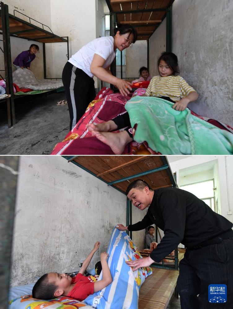 拼版照片:在广西德保县东凌镇那王小学,黄秀碧老师(上图)、黄永勇老师(下图)在照顾学生午休(2023年3月22日摄)。那王小学只有黄秀碧和黄永勇这两名夫妻教师,他们分别在这里工作了31年和20年。他们每天除了给学生上课,为学生做午饭,晚上还要照顾住校生。