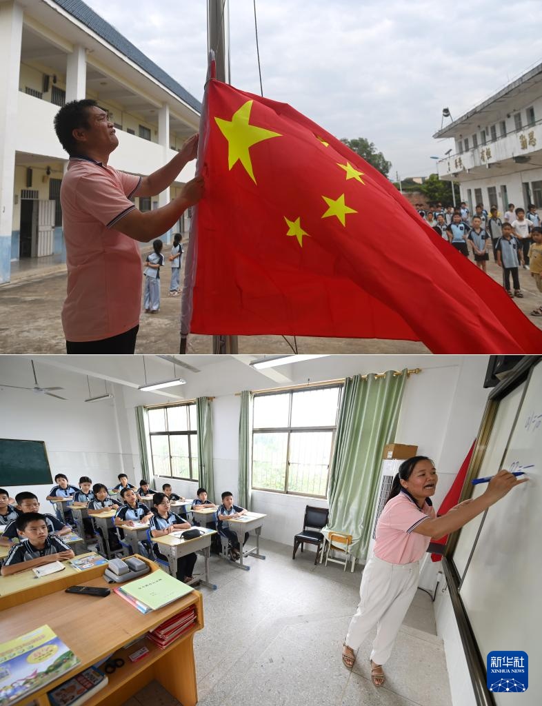 拼版照片:在广西南宁市邕宁区蒲庙镇光和小学那岳教学点,梁金养老师在做升国旗准备(上图);莫庆如老师在给学生上课(下图)(9月6日摄)。莫庆如和梁金养是这所教学点的一对夫妻教师,他们分别在2004年和2005年到这里工作,2022年因敬业奉献一起登上“中国好人榜”。