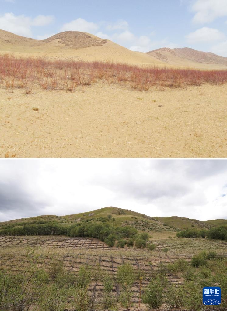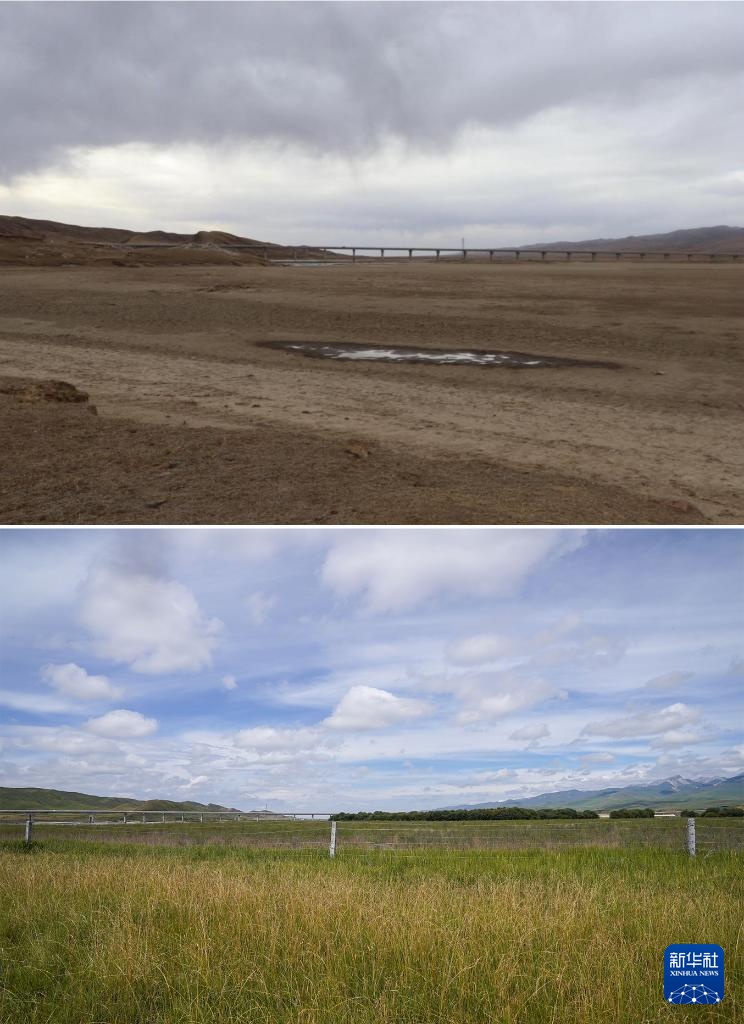 拼版照片:上图为若尔盖县辖曼镇一处沙化土地治理前的场景(资料照片);下图为该处采用“高山柳沙障+植灌+种草+施肥+围栏+管护”的措施进行综合治理后的场景(9月6日摄,新华社记者胥冰洁摄)。