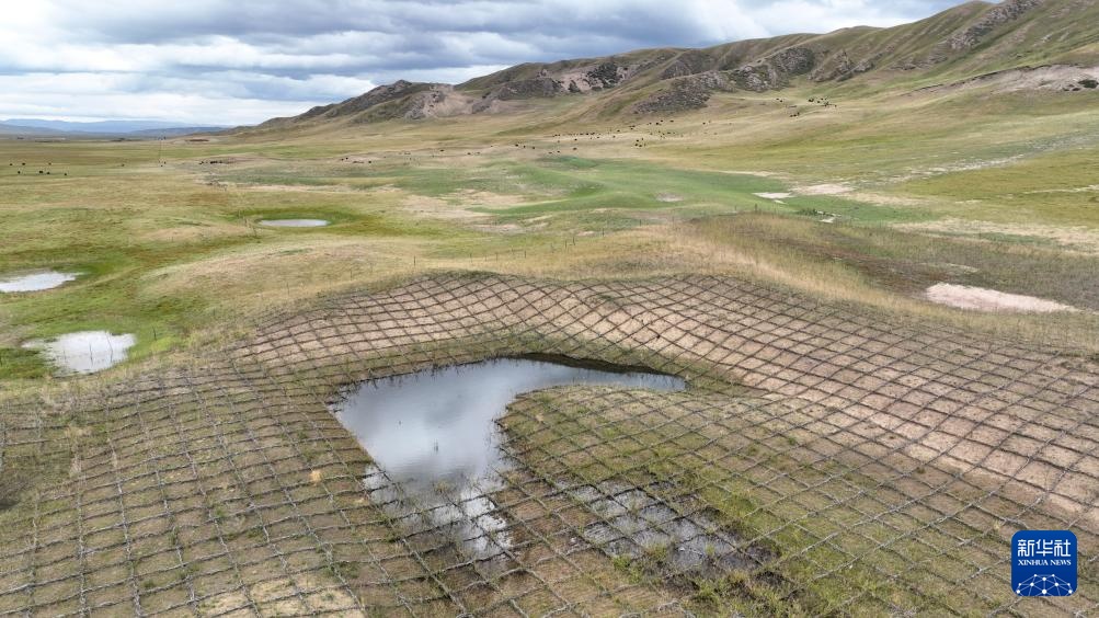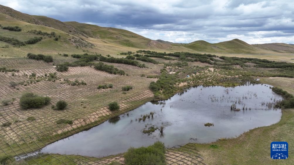 9月6日拍摄的若尔盖县辖曼镇一处沙化土地治理后的场景,每一小方格是由红柳枝编织而成的沙障,可在一定范围内控制沙子的流动(无人机照片)。