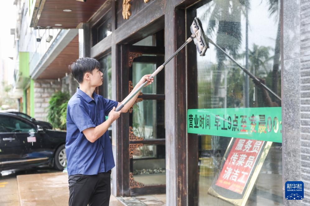 9月7日,在海口市四东路,一家餐馆的工作人员在打扫卫生。