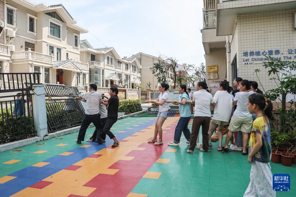 9月8日,海口市金贸中心幼儿园芙蓉分园的老师合力拉起学校倾斜的围栏。