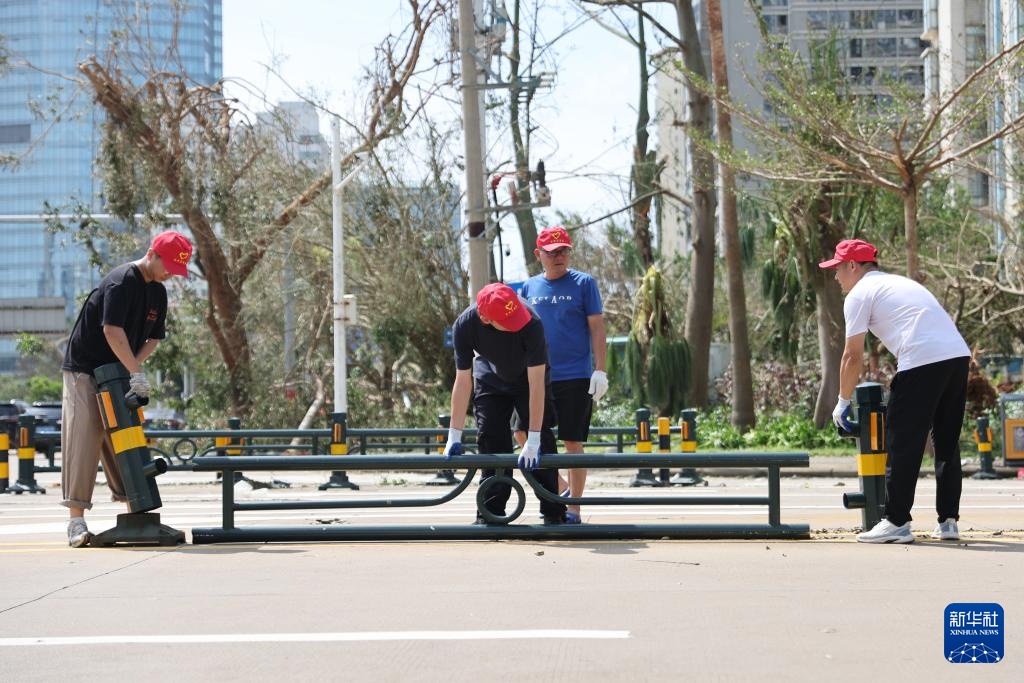 9月8日,志愿者在海口市红棉西路上扶起倒地的栏杆。