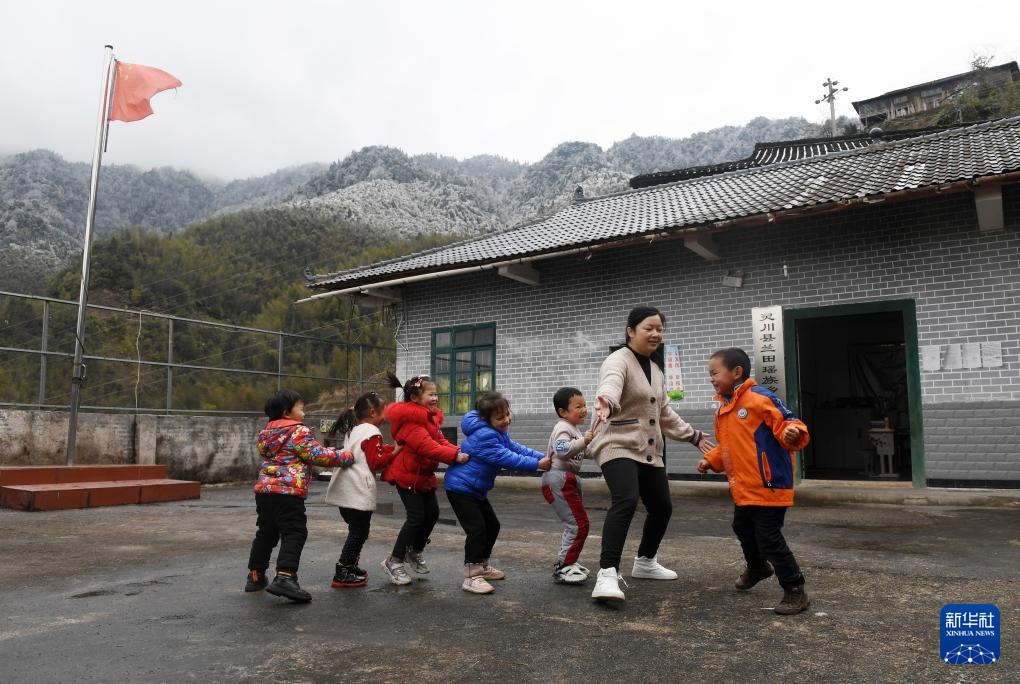 在广西灵川县兰田瑶族乡东良教学点,“85后”老师石夏月和学生做游戏(2022年2月24日摄)。