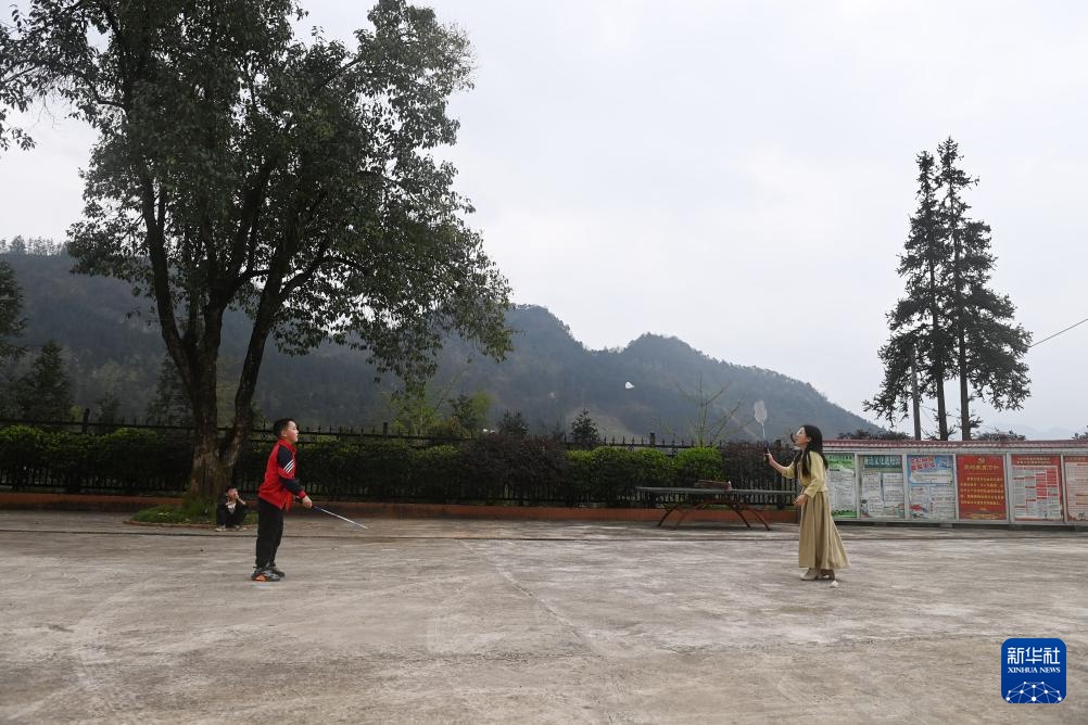 在广西灌阳县洞井瑶族乡野猪殿小学,“95后”老师赵艳和学生打羽毛球(2024年3月27日摄)。