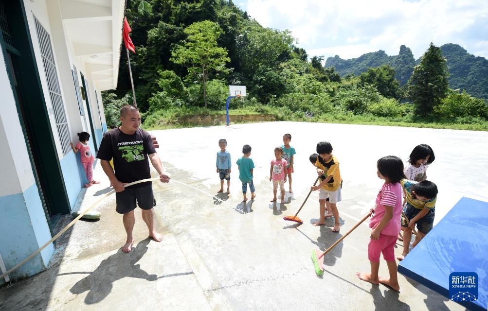 在广西天等县龙茗镇东南村烟屯教学点,“80后”老师董祥在和学生一起做卫生(2015年6月23日摄)。