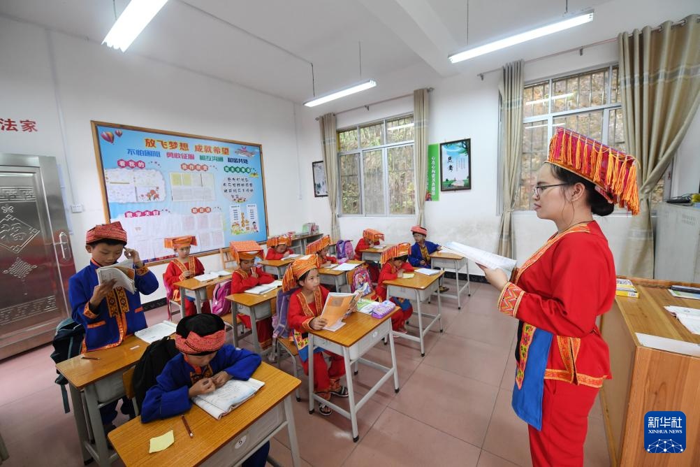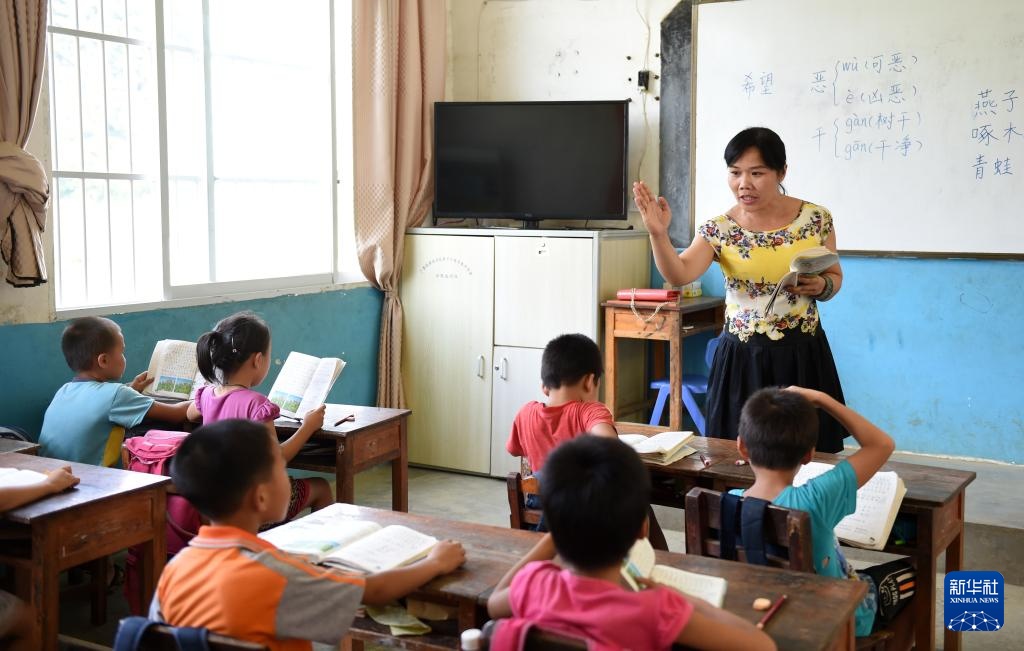 在广西金秀瑶族自治县忠良乡更范教学点,“85后”老师卢秀芬在给学生上课(2019年6月5日摄)。