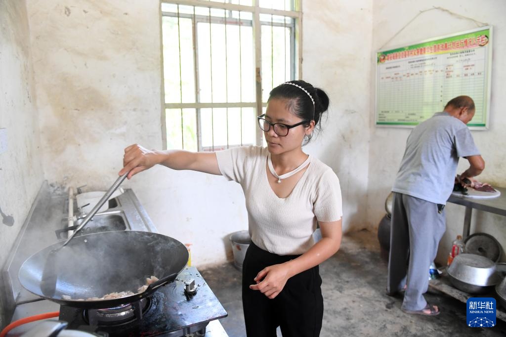 在广西都安瑶族自治县龙湾乡琴棋小学,“85后”老师蓝巧春(左)在给学生做午饭(2017年8月31日摄)。