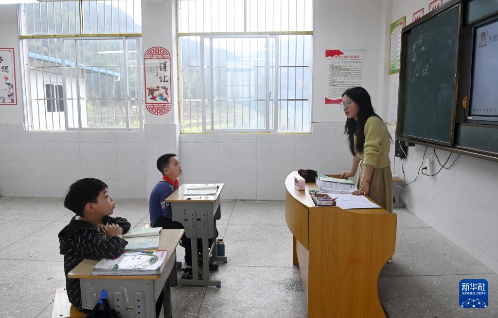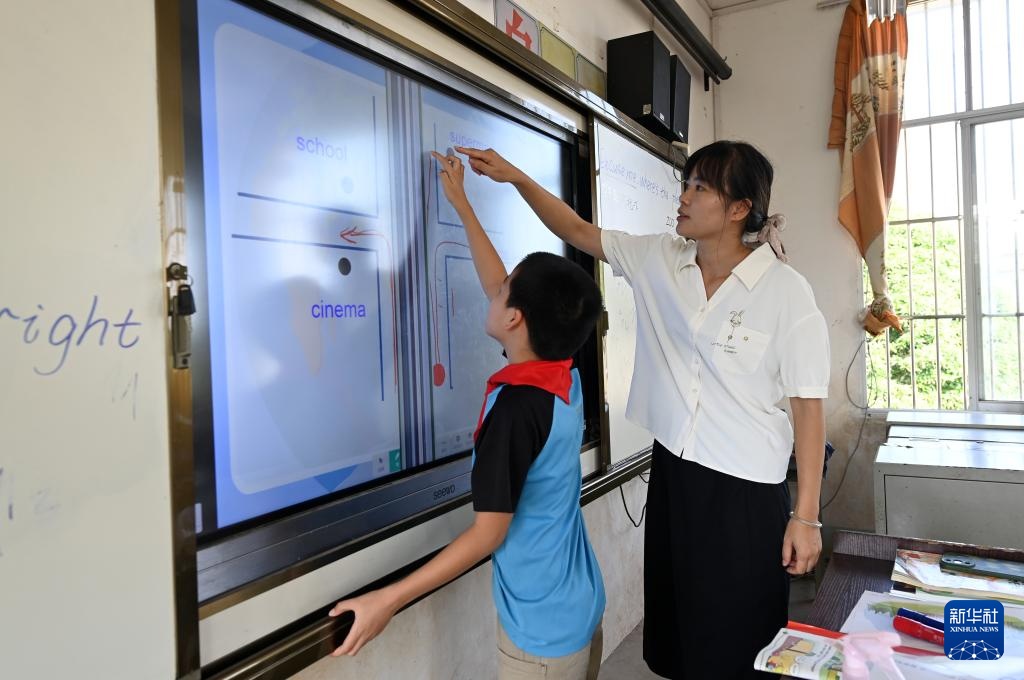在广西南宁市邕宁区中和镇中心学校周禄教学点,“90后”老师何海香指导学生完成课堂作业(2024年9月4日摄)。
