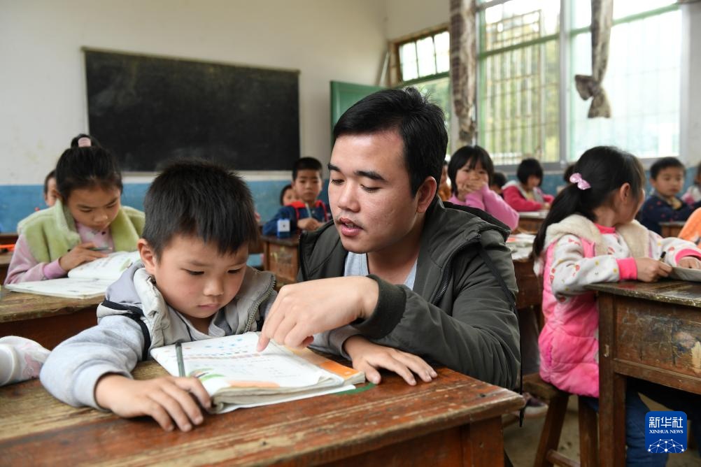 在广西富川瑶族自治县新华乡湖广小学,“90后”老师谢其鹤在辅导学生功课(2019年3月20日摄)。