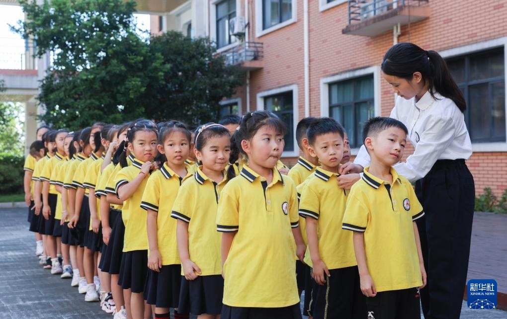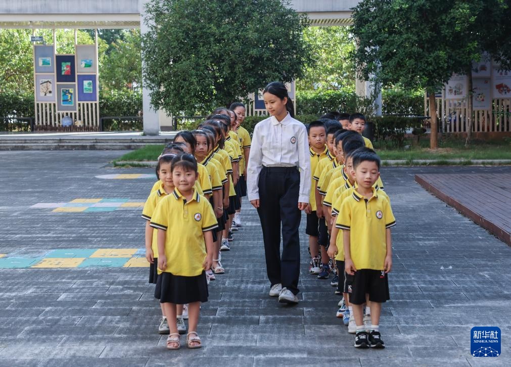 9月9日,在诸暨市暨南街道暨南小学,六年级学生林欣烨(右一)担任小老师,带领一年级学生站队、出操。