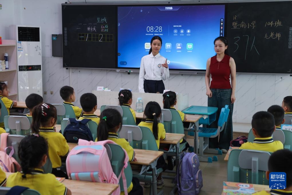 9月9日,在诸暨市暨南街道暨南小学,六年级学生林欣烨(后左)担任小老师,给一年级学生上课。