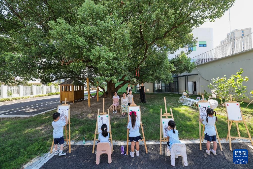 9月9日,诸暨市暨南街道三江幼儿园的小朋友争当“小画师”,在园内的百年大樟树下为老师们画肖像画。