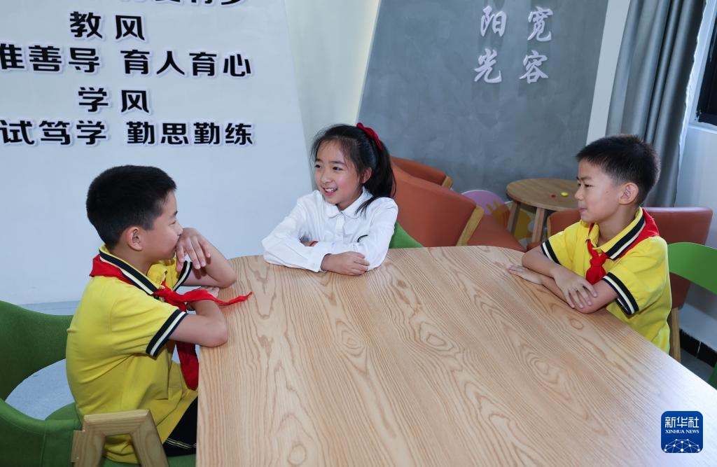 9月9日,在诸暨市暨南街道暨南小学,担任小老师的同学(中)在调解同学矛盾,体验教师日常调解班级学生问题的过程。