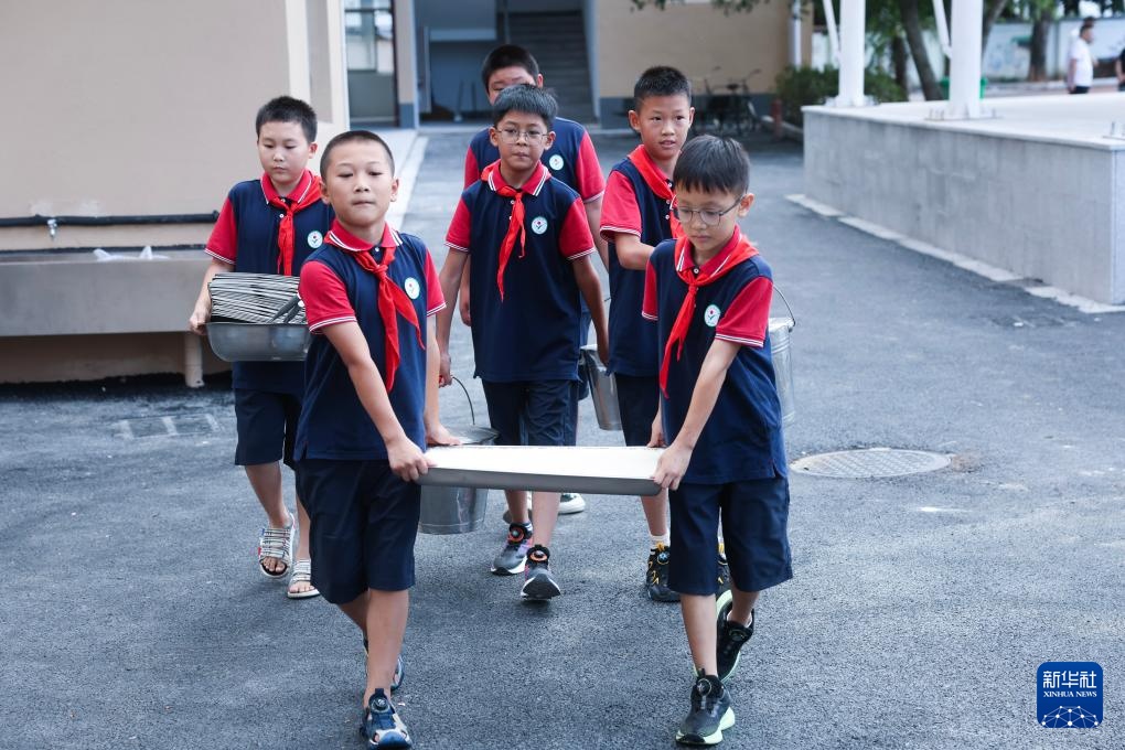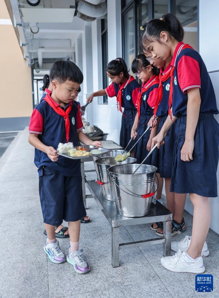 9月9日,诸暨市暨南街道街亭小学的学生担任就餐管理小老师,给低年级学生拿餐、分餐。