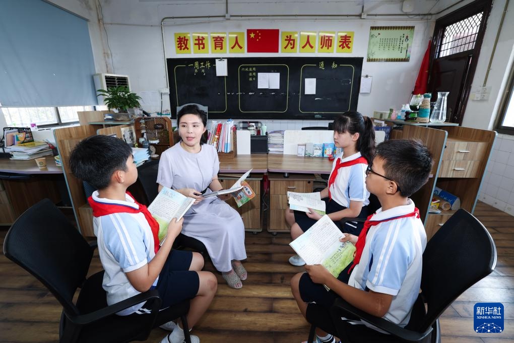 9月9日,诸暨市暨南街道新壁小学的教师给担任小老师的学生讲解教案和课程内容。