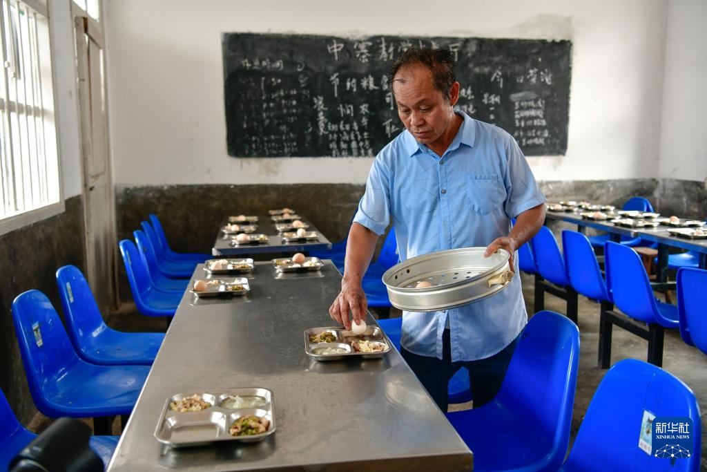孟荣达与妻子在照看学生吃午饭(9月6日摄)。